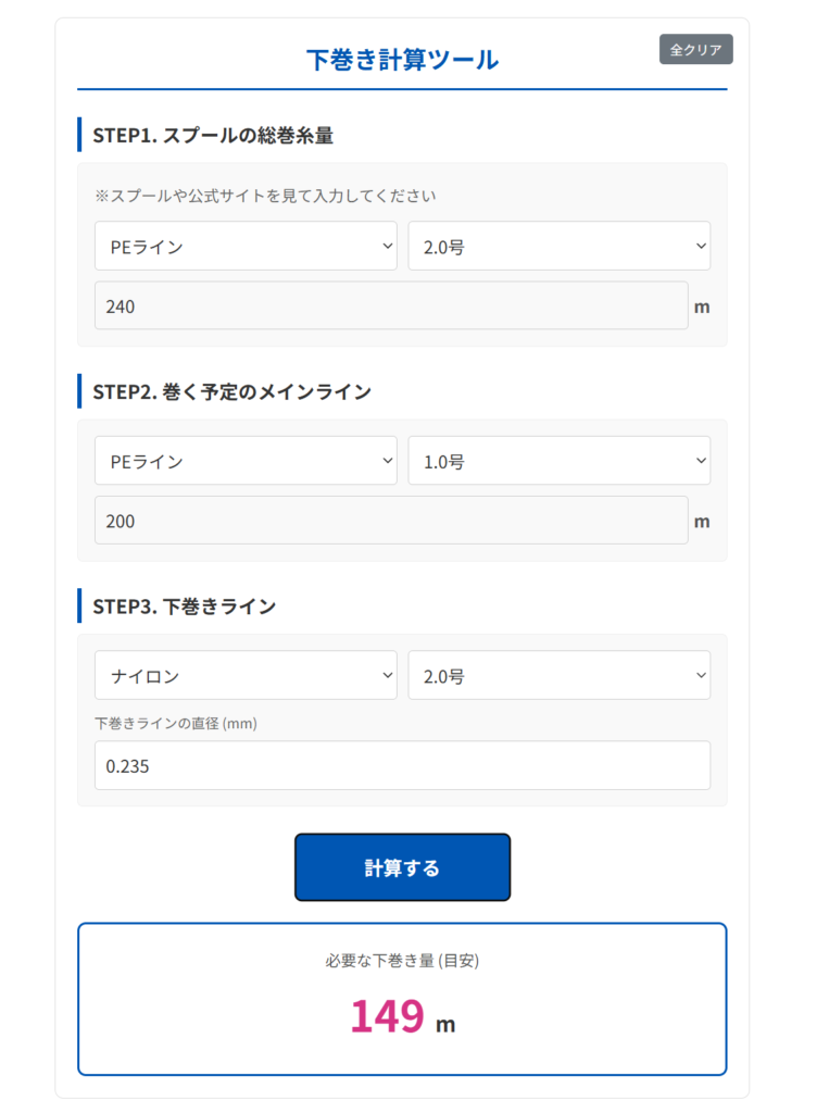 リールの下巻きの長さをどんなラインでも計算できる便利ツール