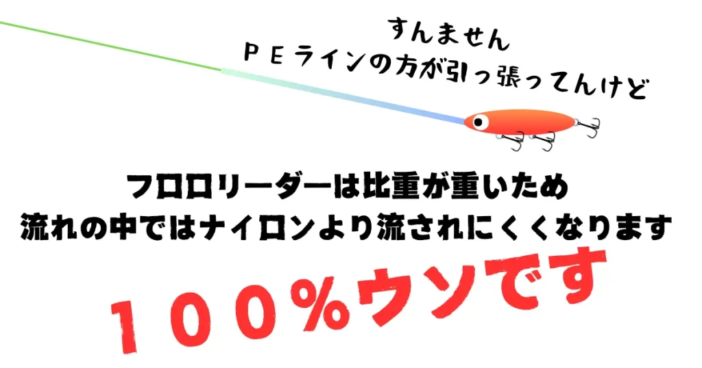 フロロリーダーは比重が重いため、流れの中ではナイロンより流されにくくなる?アホとしか言えないウソ