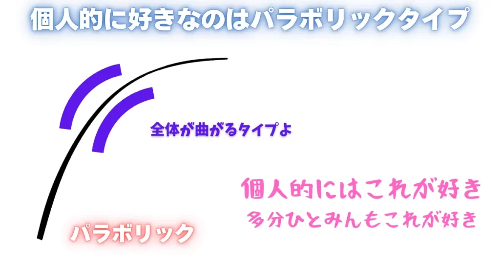 全体が曲がるタイプでも、パワーのあるパラボリックとしなやかなパラボリックがあるんです