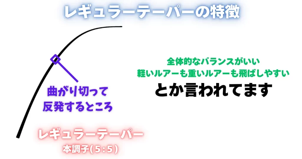 - レギュラーテーパー=真ん中くらいが曲がる(5:5調子)