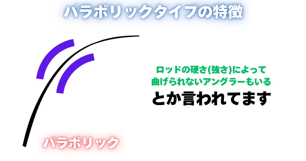 - パラボリックタイプは全体が曲がるので、ロッドが硬いか柔らかいかでスローにもファストにもなる