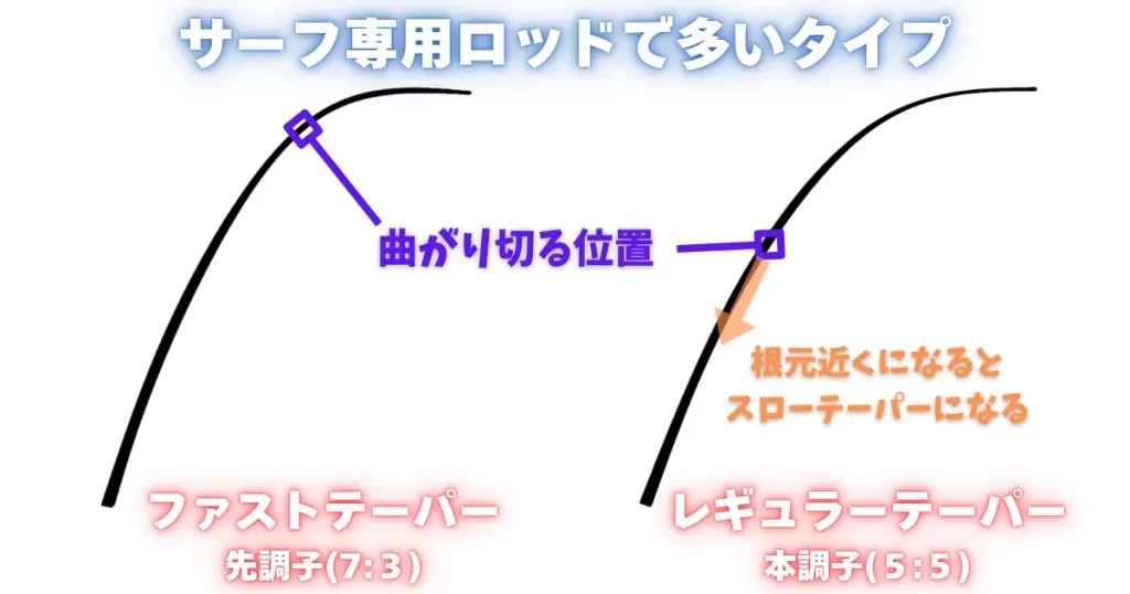 各社のサーフ専用ロッドはほとんどがこのレギュラーテーパーで、ファストテーパー寄りのレギュラーテーパーが多いと言えます