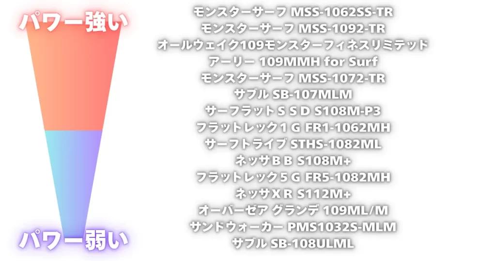 サンドウォーカーやサーフトライブ、モンスターサーフは曲がりはパラボリックタイプですが、ロッドのパワーが全然違います