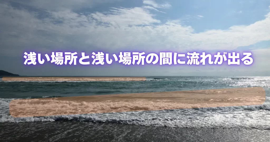 流れ(離岸流)の開きは流れが広がって弱くなり、その先は更に深くなるカケアガリが多い