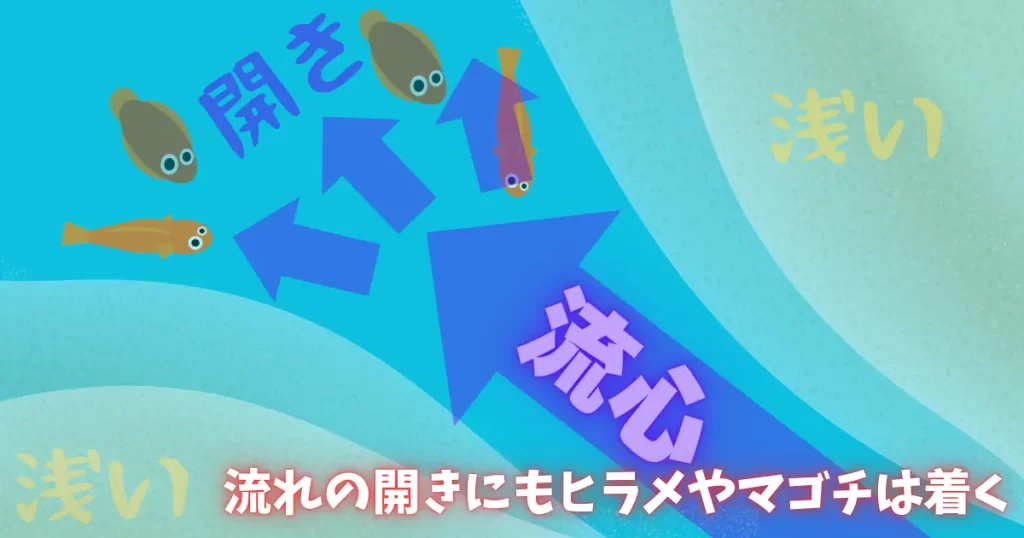 真横に近い流れが発生する場所でも、開きは沖向きに広がる事が多いんですが、これも近い場所になりやすく狙い目ですね