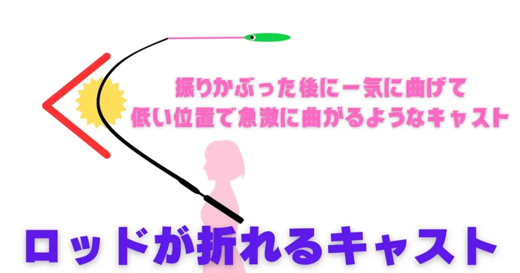 軽いルアーやロッドのパワーが強すぎる場合は、キャスト時にロッドが曲がらないまま振り終わります